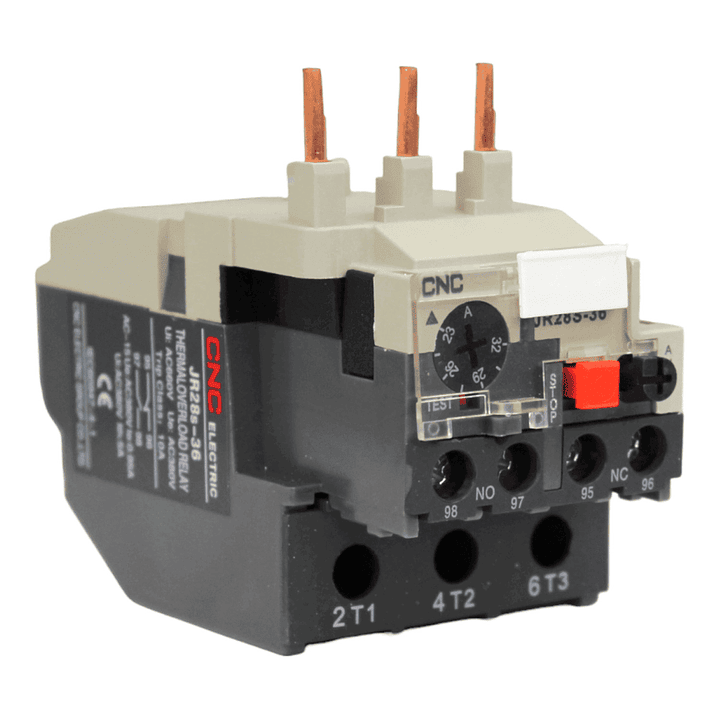 El relé de sobrecarga térmica de la serie JR28 [s] es adecuado para sobrecarga y falla de fase de motores A.C con frecuencia de 50/60Hz, tensión hasta 690V, Bajo servicio de 8 horas o servicio intermitente. Funcionan midiendo el calor generado por la corriente que fluye a través de ellos, desconectando el circuito en caso de detectar un aumento excesivo que pueda dañar los equipos.